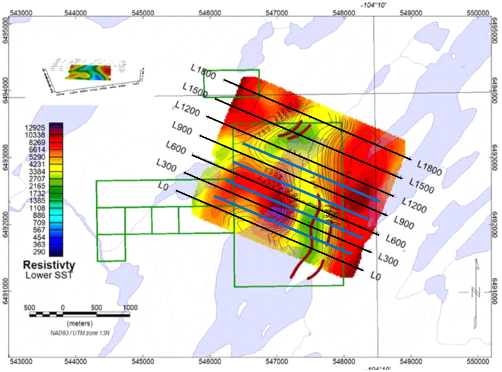 Figure 1. Marked F4 Uranium Corp.’s ground DC Resistivity and Moving Loop Time Domain electromagnetic (“EM”) surveys. The blue lines are the proposed infill lines of EM.